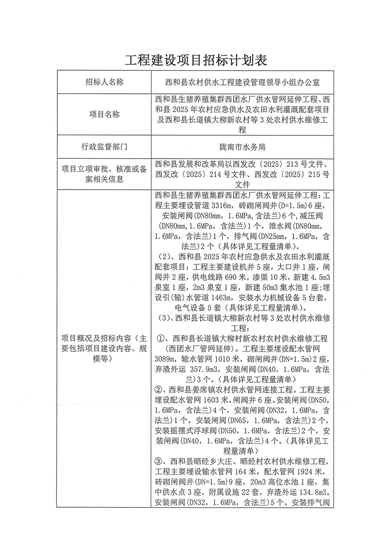 西和縣生豬養(yǎng)殖集群西團水廠供水管網(wǎng)延伸工程、 西和縣2025年農(nóng)村應(yīng)急供水及農(nóng)田水利灌溉配套項目及西和縣長道鎮(zhèn)大柳新農(nóng)村等3處農(nóng)村供水維修工程