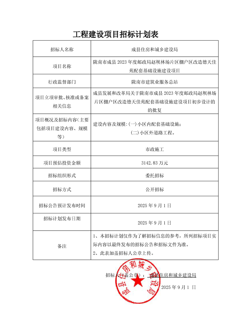 隴南市成縣2023年度郵政局趙壩林場片區(qū)棚戶區(qū)改造德天佳苑配套基礎(chǔ)設(shè)施建設(shè)項目