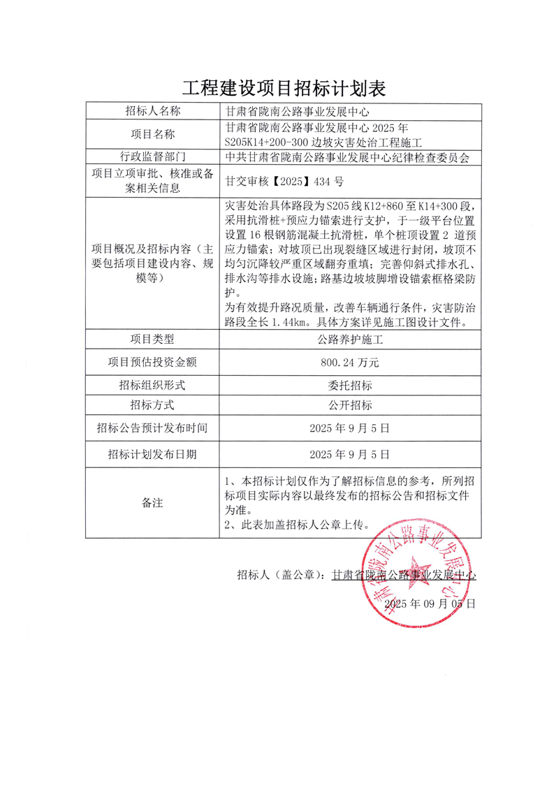甘肅省隴南公路事業(yè)發(fā)展中心2025年S205K14+200-300邊坡災害處治工程施工