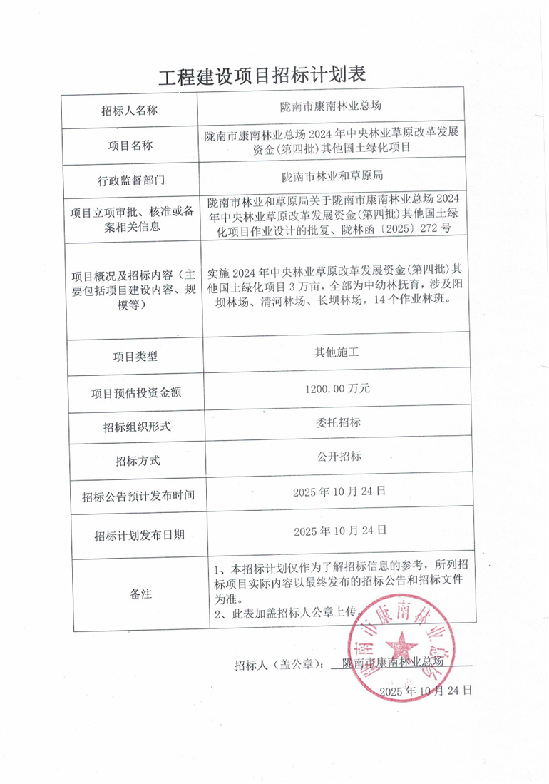 隴南市康南林業(yè)總場(chǎng)2024年中央林業(yè)草原改革發(fā)展資金(第四批)其他國(guó)土綠化項(xiàng)目