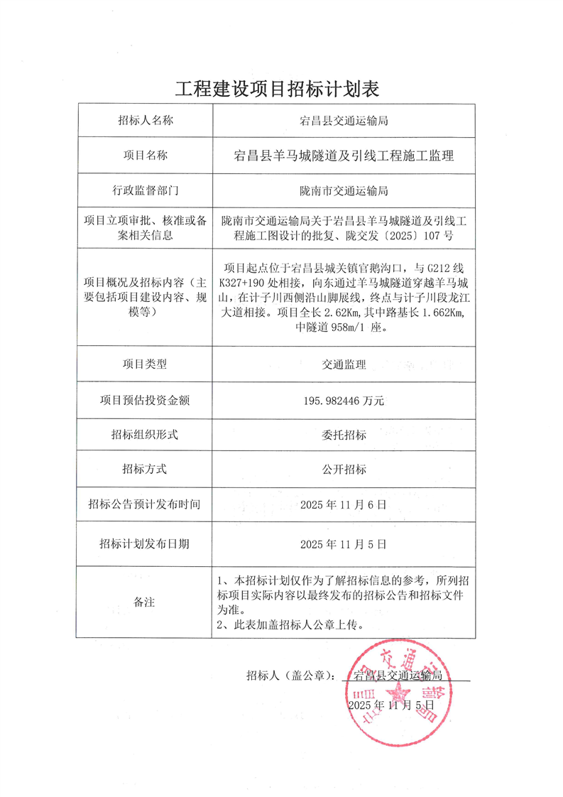 宕昌縣羊馬城隧道及引線(xiàn)工程施工監(jiān)理