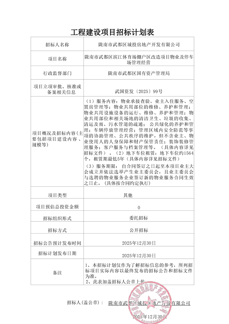 隴南市武都區(qū)濱江體育場(chǎng)棚戶區(qū)改造項(xiàng)目物業(yè)及停車(chē)場(chǎng)管理經(jīng)營(yíng)