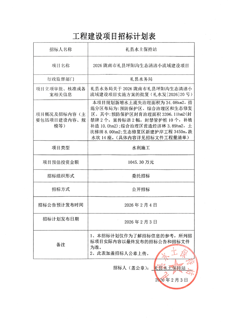 2026隴南市禮縣坪陽(yáng)溝生態(tài)清潔小流域建設(shè)項(xiàng)目
