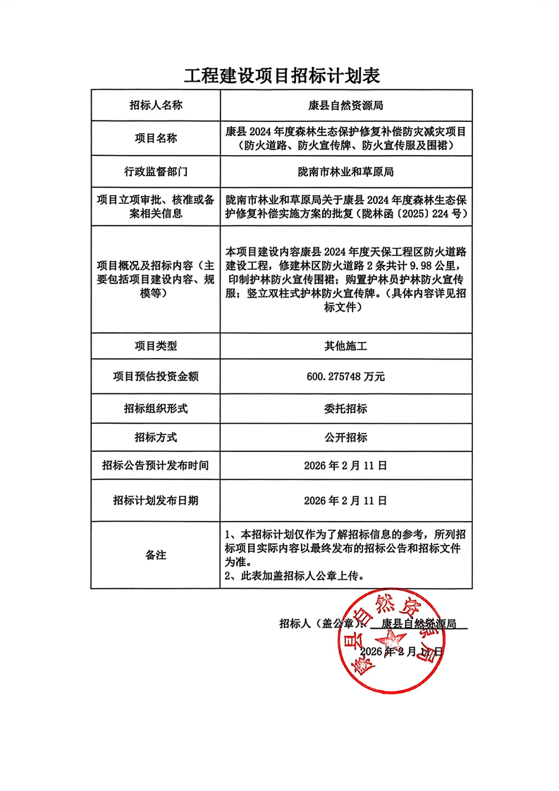 康縣2024年度森林生態(tài)保護(hù)修復(fù)補(bǔ)償防災(zāi)減災(zāi)項(xiàng)目(防火道路、防火宣傳牌、防火宣傳服及圍裙)