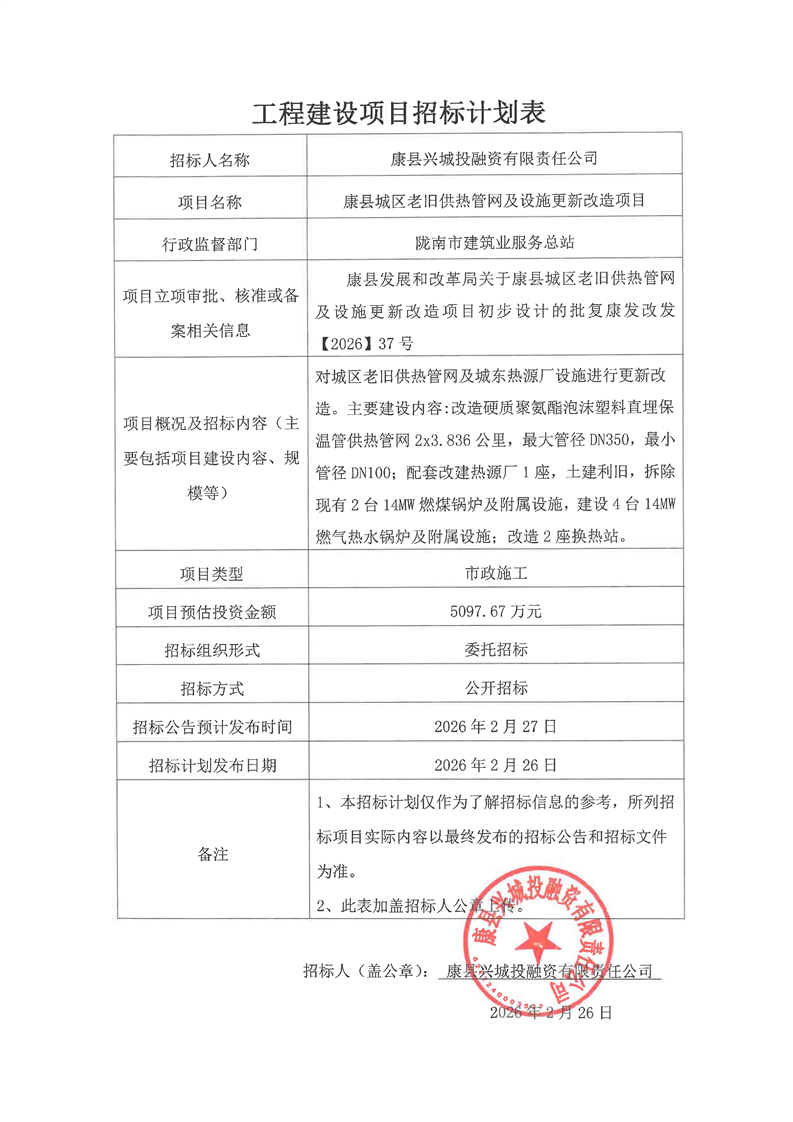 康縣城區(qū)老舊供熱管網及設施更新改造項目