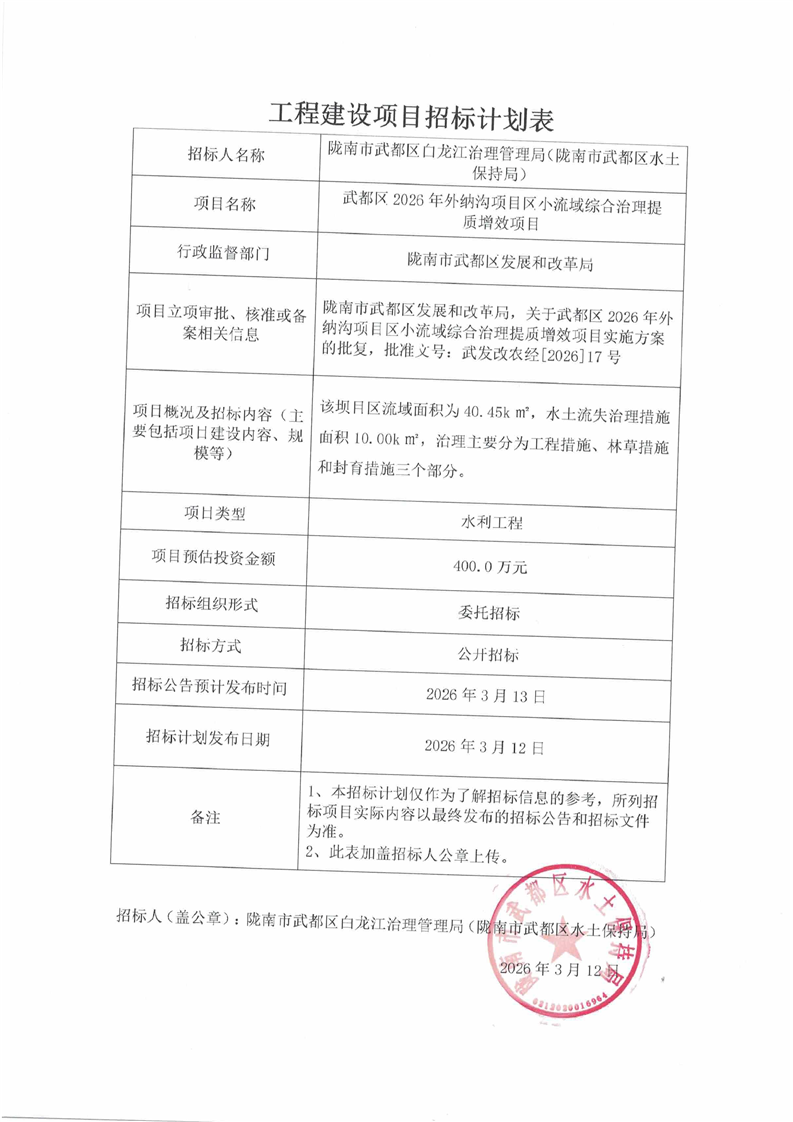 武都區(qū)2026年外納溝項(xiàng)目區(qū)小流域綜合治理提質(zhì)增效項(xiàng)目